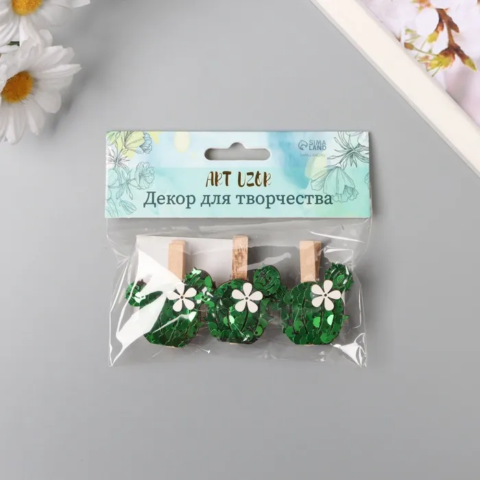 Декор для творчества дерево «Прищепка. Кактус с цветком», пайетки, набор 3 шт., 1.5×4×4.8 см — Характеристики