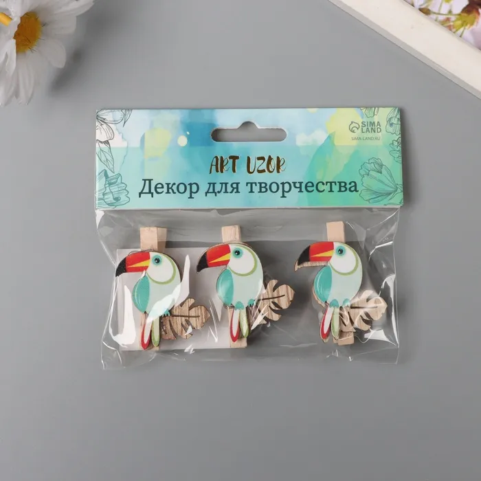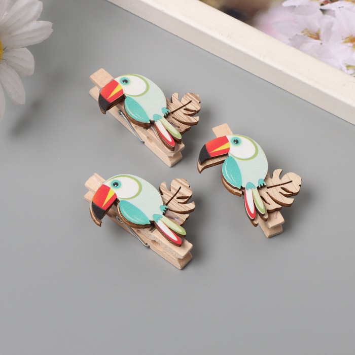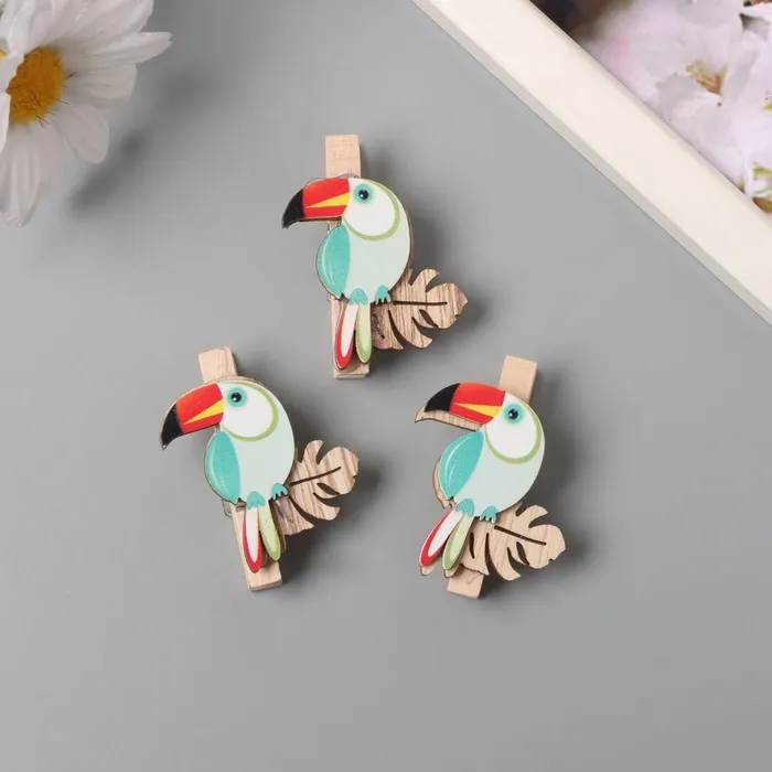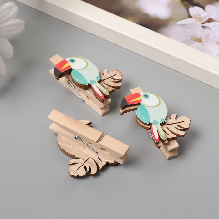 Декор для творчества дерево «Прищепка. Тукан на листе монстеры», набор 3 шт., 1.3×3.7×4.5 см