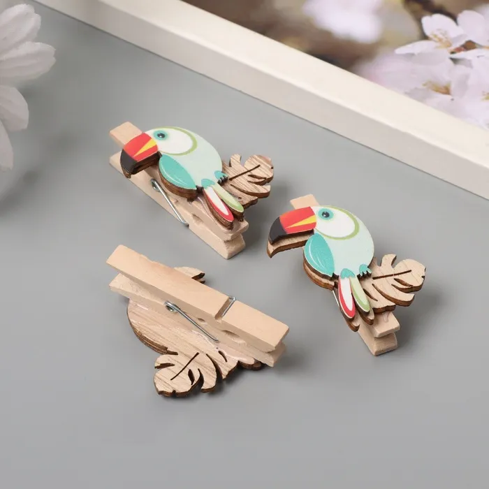 Декор для творчества дерево «Прищепка. Тукан на листе монстеры», набор 3 шт., 1.3×3.7×4.5 см — Характеристики