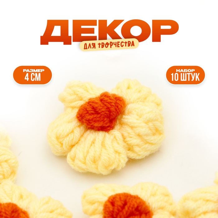 Цветок вязаный, набор 10 шт., размер 1 шт., 4 × 1,5 см, цвет жёлтый