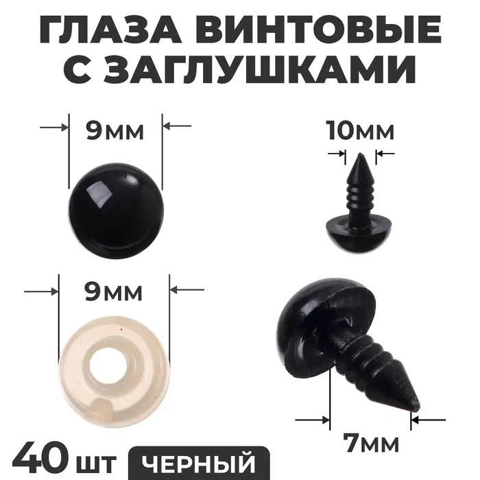 Глаза винтовые с заглушками, набор 40 шт., размер 1 шт. — 1 см, цвет чёрный
