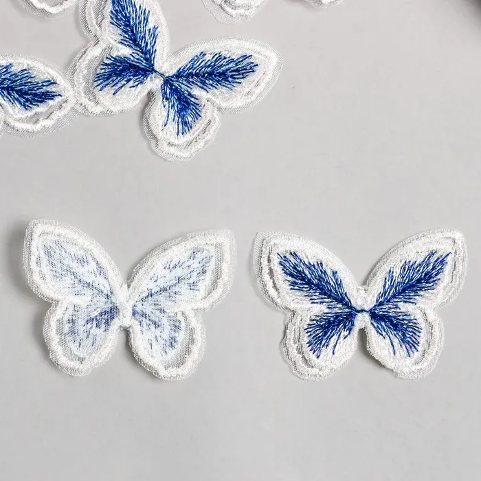 Декор для творчества текстиль вышивка «Бабочка бело-синяя», двойные крылья, 3.7×4.5 см