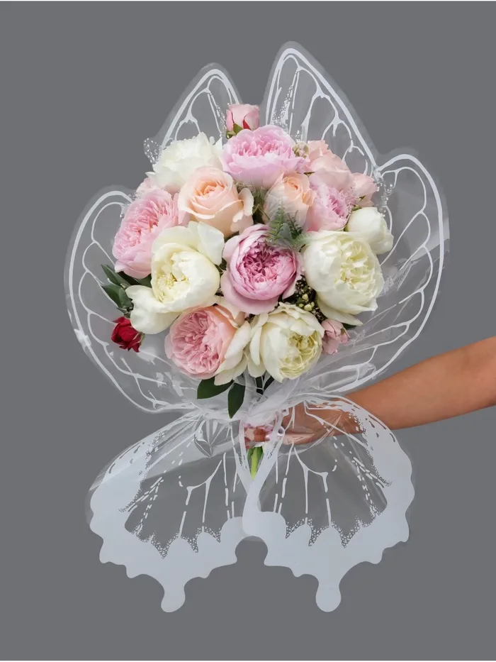 Декоративные крылья бабочки из плёнки — это элегантное решение для оформления букетов. Белый цвет с цветочным рисунком добавляет композиции нежности и романтичности, делая её идеальным подарком на 8 Марта или 14 Февраля. Материал лёгкий, но прочный, сохраняет форму и подчёркивает красоту цветов.