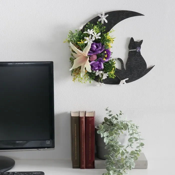Панно настенное «Кошка на месяце, фиолетовые розы», интерьерный декор, деркво, 30×30 см