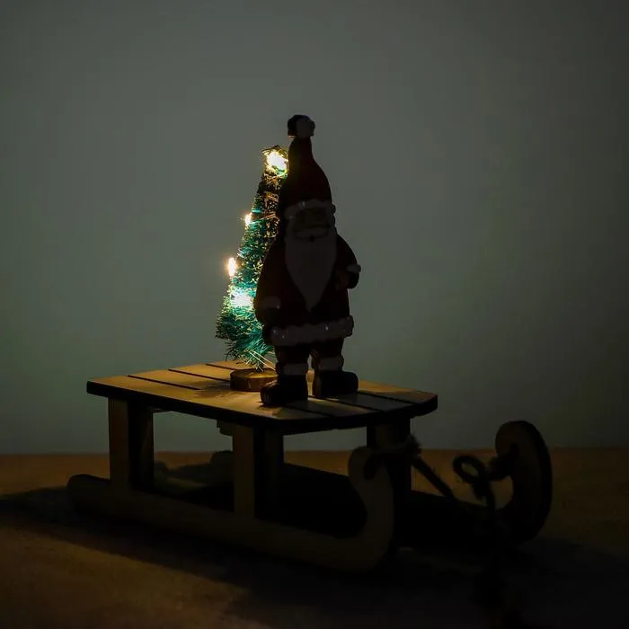 Новогодний декор с подсветкой «Дед мороз на санках» — это изящное украшение для вашего новогоднего интерьера. Выполненное из дерева с мягкой жёлтой подсветкой, изделие добавит тепло и уют в дом. Оно работает от батареек, что делает его удобным для размещения в любом месте, без необходимости подключения к розетке.