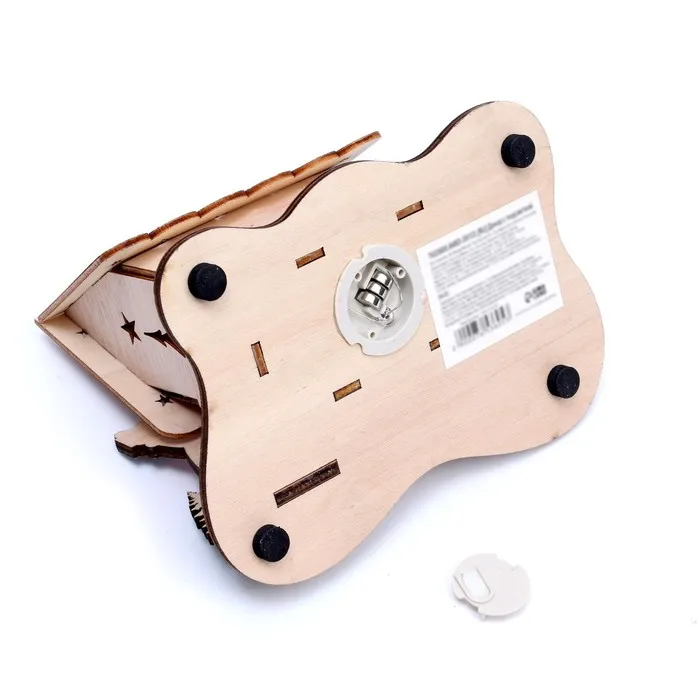 Изделие выполнено из экологичного материала — дерева и работает от батареек.