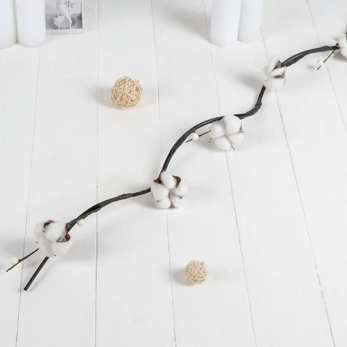 Ветки декоративные «Хлопок с шариками», высотой 150 см, в белом цвете — идеальное украшение для праздничного интерьера. Они подчеркнут стиль вашего дома, будь то датский, классический, скандинавский или шебби-шик. Основной материал стебля — натуральная лоза, цветков — мягкая вата. Прекрасно подходят для новогоднего декора, добавляя уют и изысканность в ваш дом.