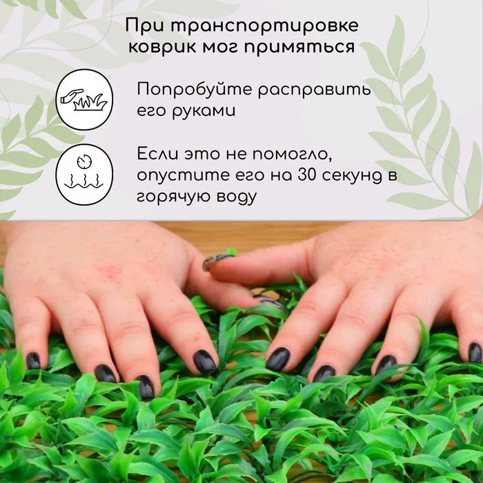 При транспортировке коврик мог примяться и зелень может выглядеть не такой объёмной и пушистой как на фото. Чтобы исправить ситуацию, разверните коврик, дайте ему отлежаться и попробуйте распушить зелень руками. Если это не помогло, опустите на 30 секунд коврик в горячую воду. После этой процедуры все листочки должны расправиться.