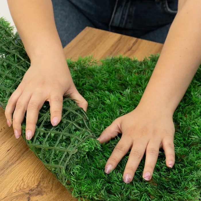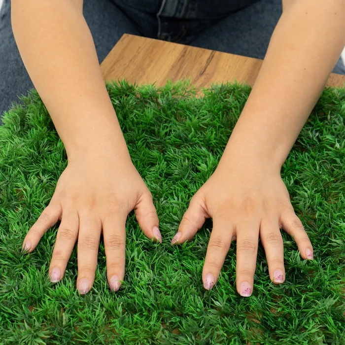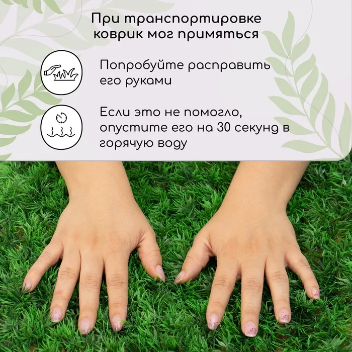 При транспортировке коврик мог примяться и зелень может выглядеть не такой объёмной и пушистой как на фото. Чтобы исправить ситуацию, разверните коврик, дайте ему отлежаться и попробуйте распушить зелень руками. Если это не помогло, опустите на 30 секунд коврик в горячую воду. После этой процедуры все листочки должны расправиться.