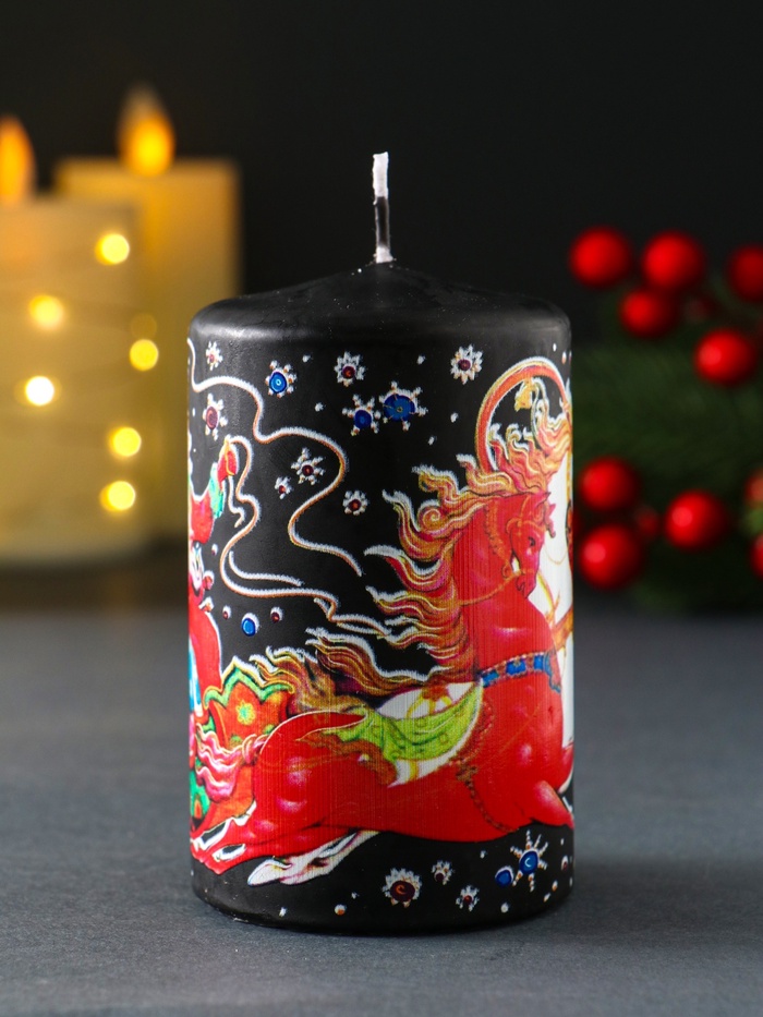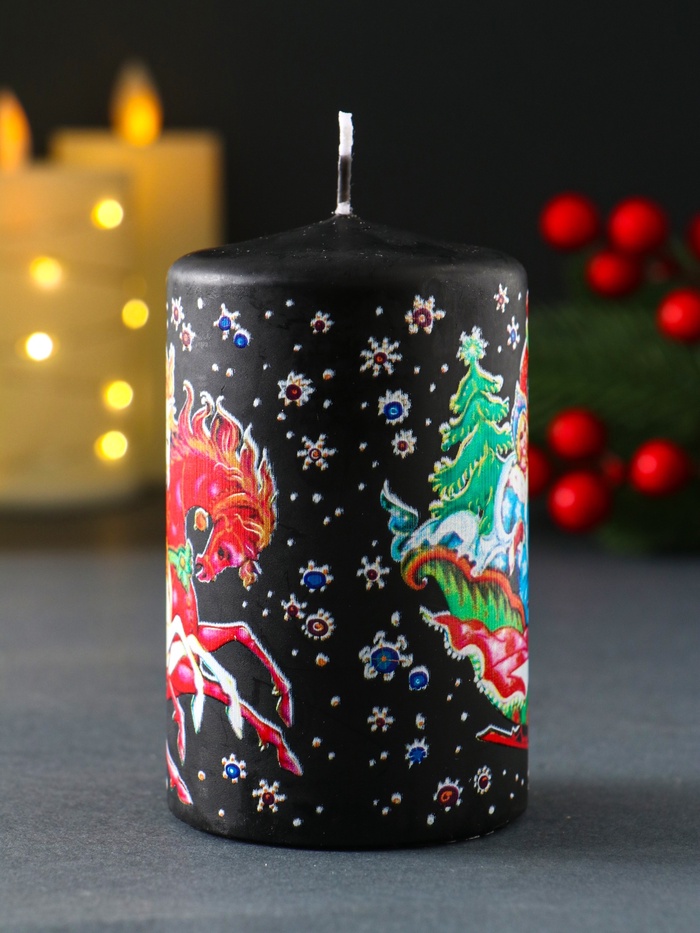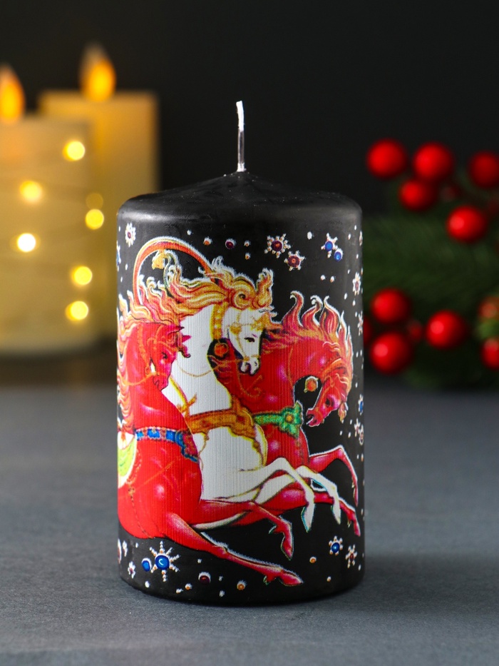 Эта праздничная свеча с новогодними конями создаёт волшебную атмосферу уюта и ожидания чуда. Её тёплый, живой свет наполнит ваш дом особым настроением, превратив зимний вечер в предвкушение праздника.