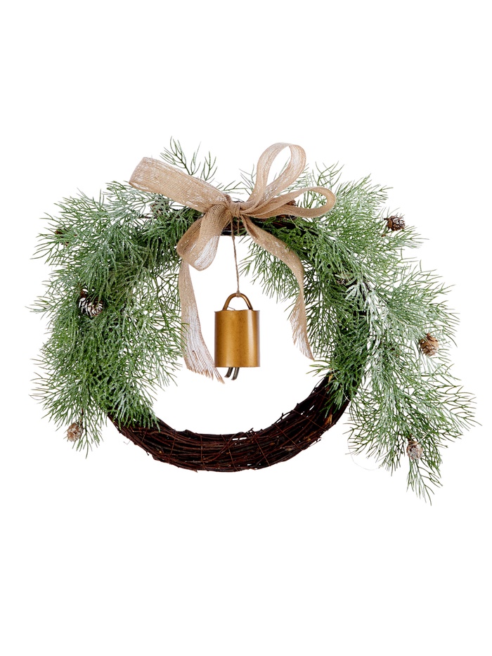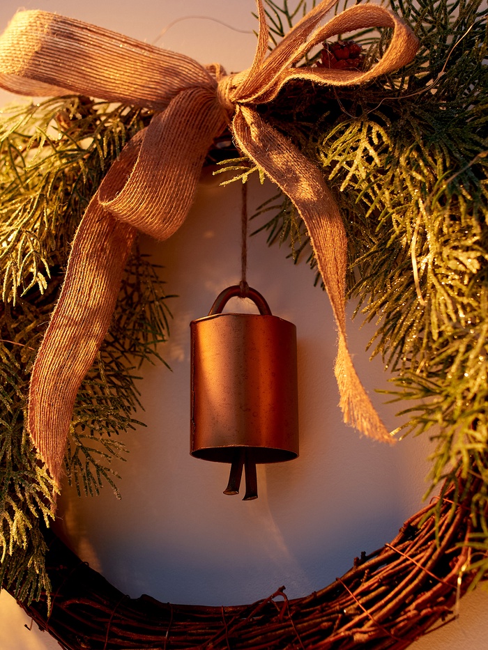 - Натуральный дизайн: сочетание дерева и пластика с детальной проработкой колокольчика и еловых веток придаёт венку живой и праздничный вид.