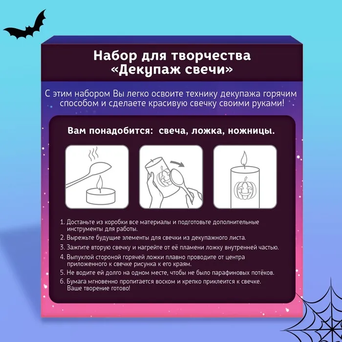 С этим набором вы легко освоите технику декупажа горячим способом и сделаете красивую свечку своими руками. А готовые творения украсят интерьер для празднования Хэллоуина!