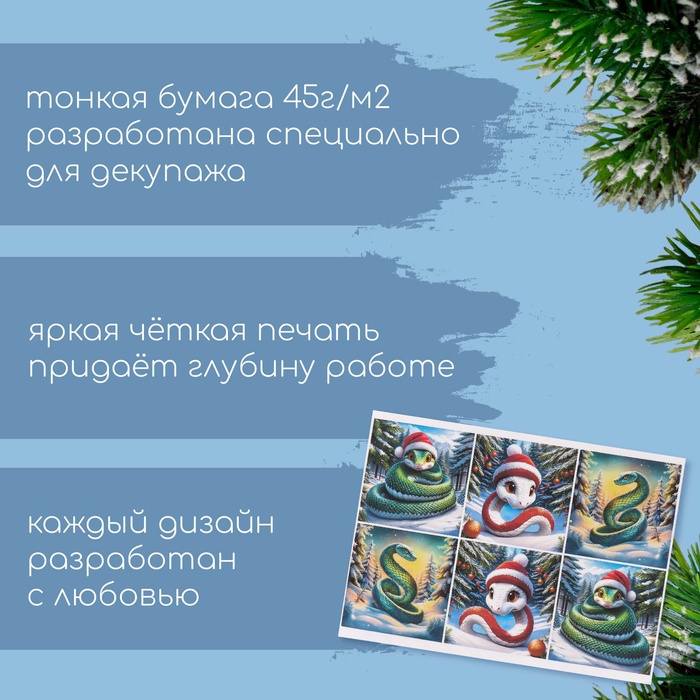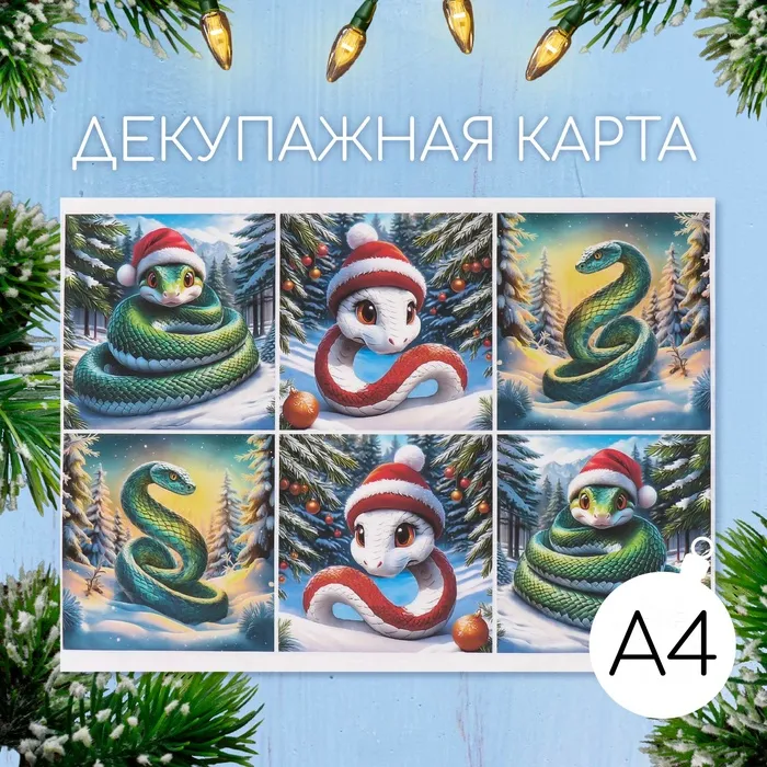 Декупажная карта «Новогодние змеи. Нейросеть», плотность 45 г/м², формат А4 — Характеристики