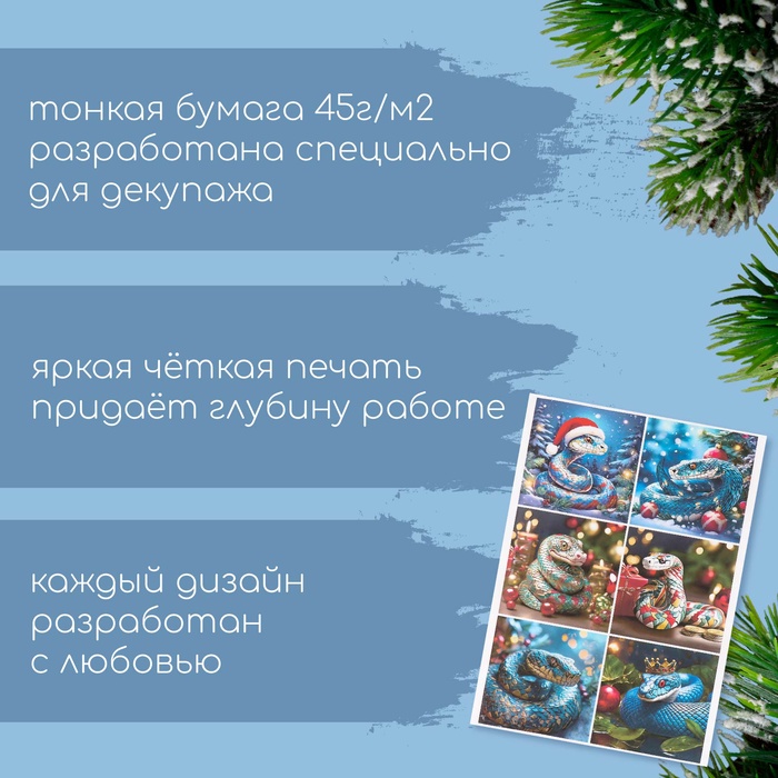 Декупажная карта «Новогодние змеи», плотность 45 г/м², формат А4 — Характеристики