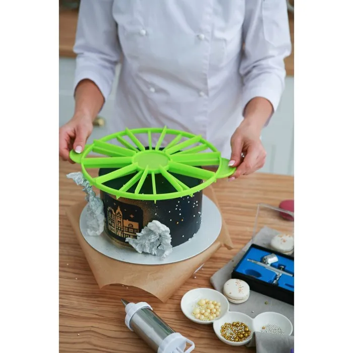 - Положите делитель на торт и немного надавите на него, чтобы появились чёткие линии.