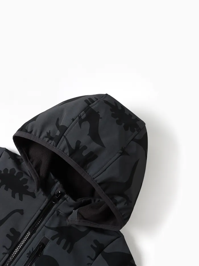 Комбинезон с динозаврами для мальчиков станет отличным выбором для занятий на свежем воздухе в переменчивую погоду. Серый и чёрный флис помогают удобно укутать ребёнка без утяжелённого утеплителя.