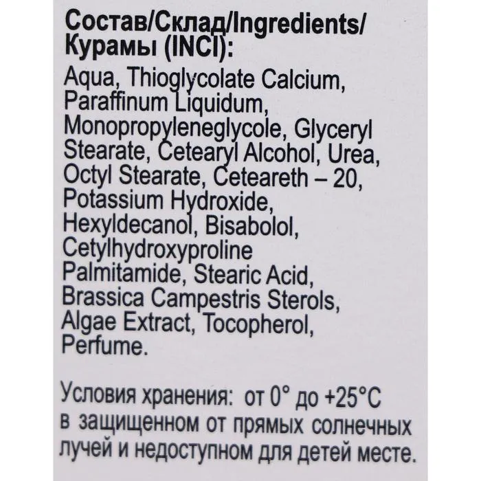- Potassium Thioglycolate (тиогликолат калия) - активный компонент депилятора, который разрушает кератиновые связи в волосах, делая их более мягкими и удаляемыми;