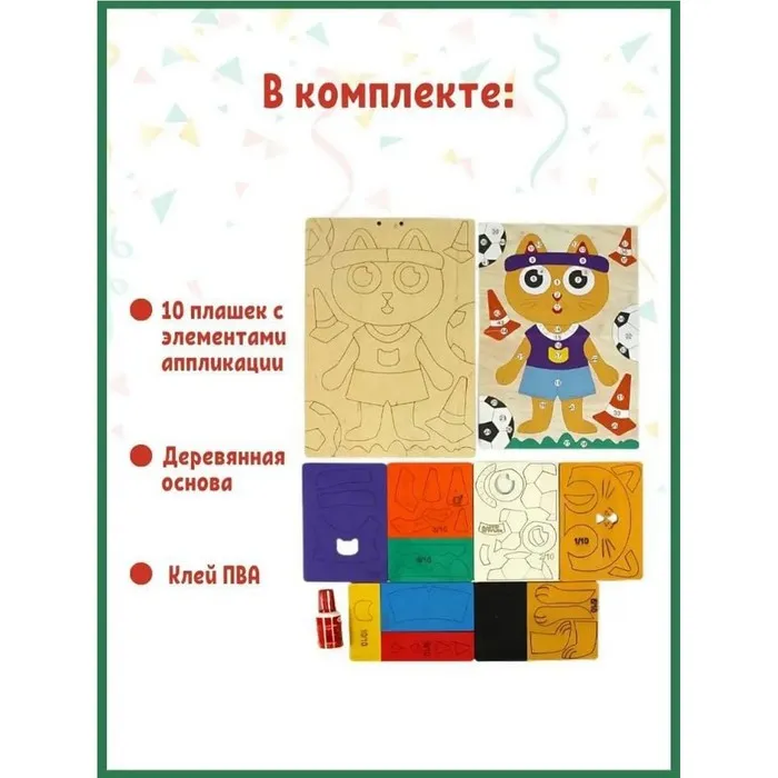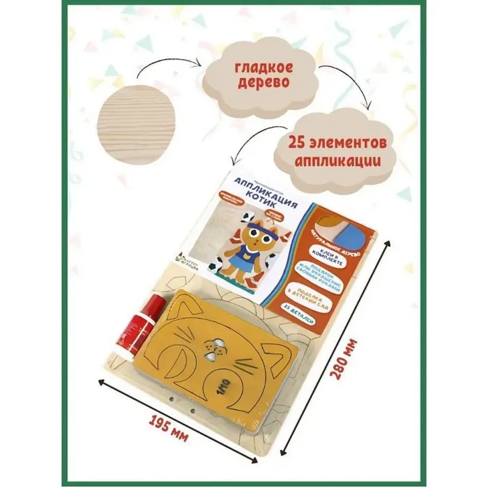 Деревянная аппликация «Котик» — сделана из высококачественной древесины, детали не деформируются, приятны на ощупь и комфортны для рук ребёнка.