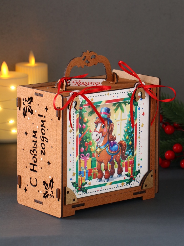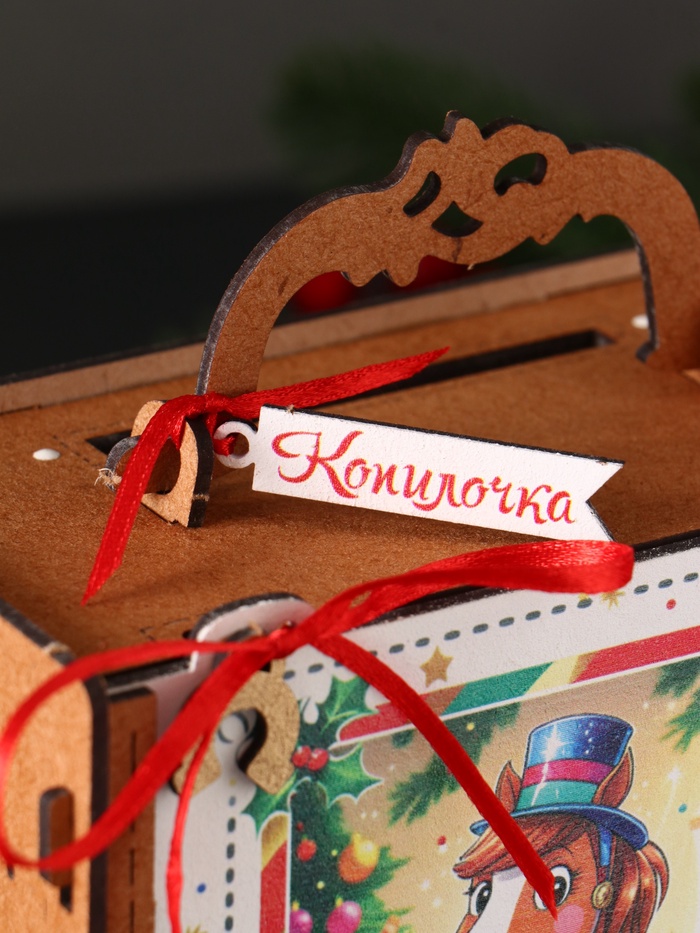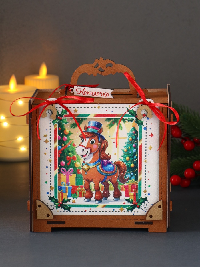 Представьте копилку, которая не только собирает ваши сбережения, но и наполняет дом духом праздника — эта фигурная конструкция из МДФ с ручкой и разноцветным покрытием, украшенная лошадкой и ёлкой, символизирует Новый год и удачу. Размеры 16.5×16×9.5 см позволяют удобно размещать её на столе или полке, делая процесс накопления монет и купюр частью семейных традиций.