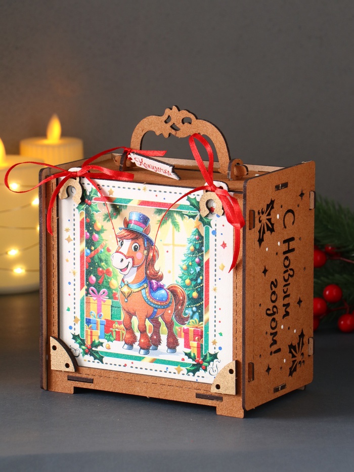 - Праздничная атмосфера: новогодняя тематика с лошадкой и ёлкой создаёт позитивное настроение и подходит для подарков.