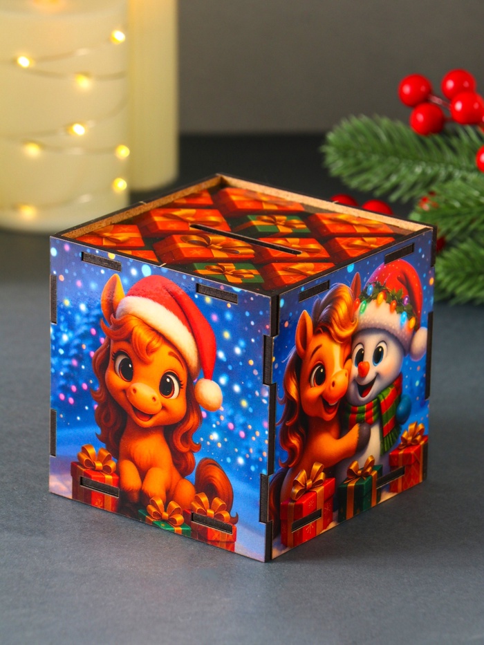Деревянная копилка для денег «Снеговик с новогодней коняшкой», куб, 10×10×10 см, (набор 7 деталей) — Характеристики