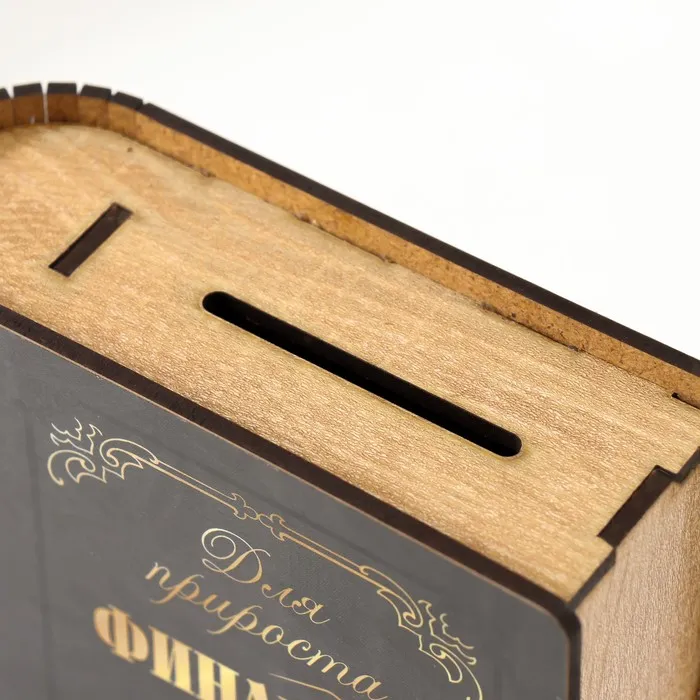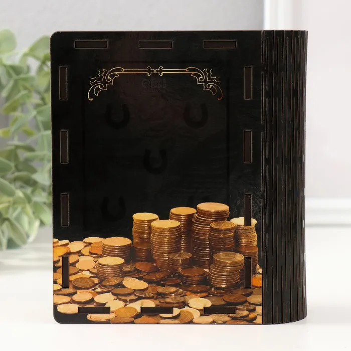 Размеры 14×12×5 см позволяют удобно хранить как купюры, так и монеты, а открытый тип конструкции делает доступ к накоплениям простым и быстрым. Изготовленная из ЛХДФ с бумажным покрытием, копилка обладает приятной фактурой и лёгкостью.
