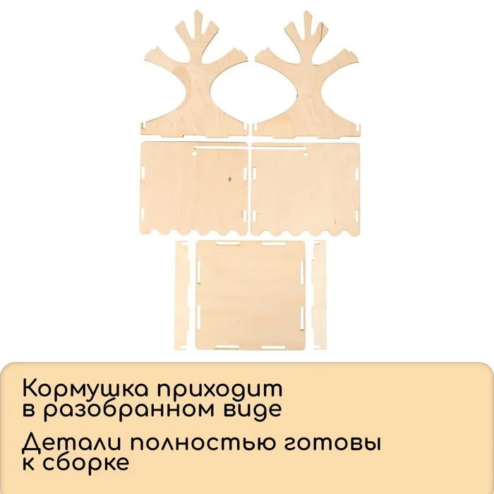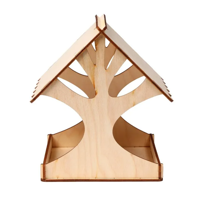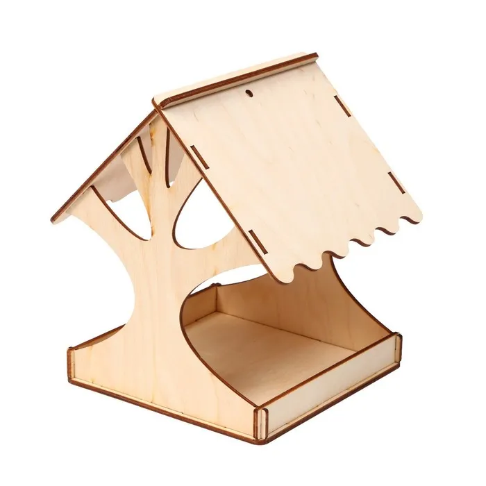 Чтобы собрать кормушку, аккуратно соедините фанерные детали, вставляя их в пазы. Используйте клей для лучшей фиксации. При желании модель можно раскрасить или задекорировать.