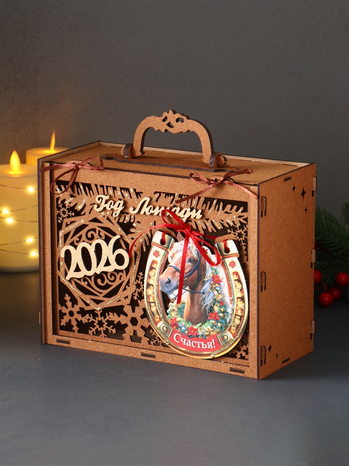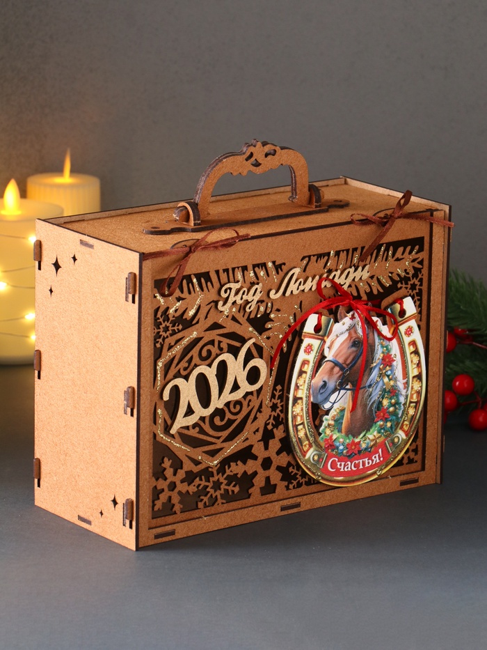 Эта деревянная шкатулка, выполненная из высококачественного МДФ с изящным коричневым покрытием, воплощает атмосферу наступающего Нового года и символизирует Год Лошади по восточному календарю. Её прямоугольная форма и продуманные размеры 23×18×10,5 см делают изделие удобным для хранения различных мелочей, а ручка обеспечивает комфортное перемещение и использование.