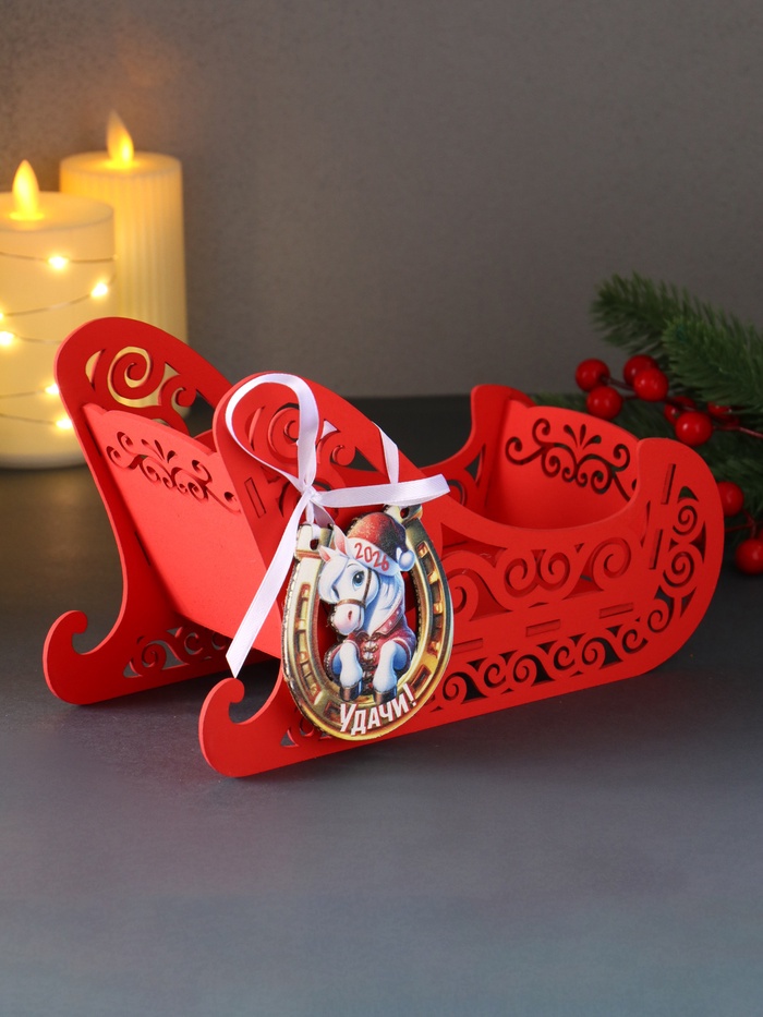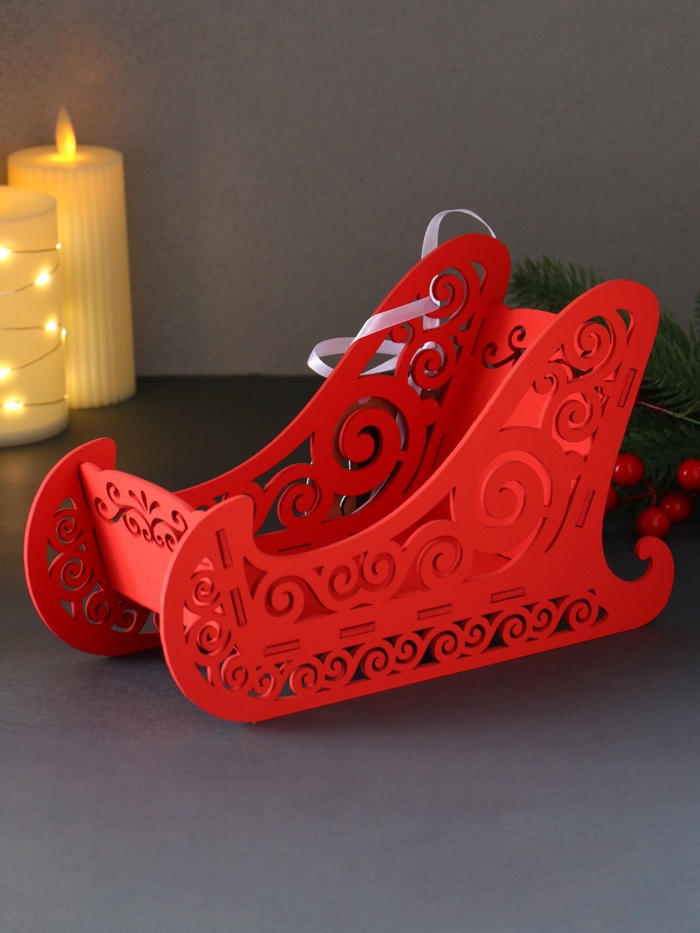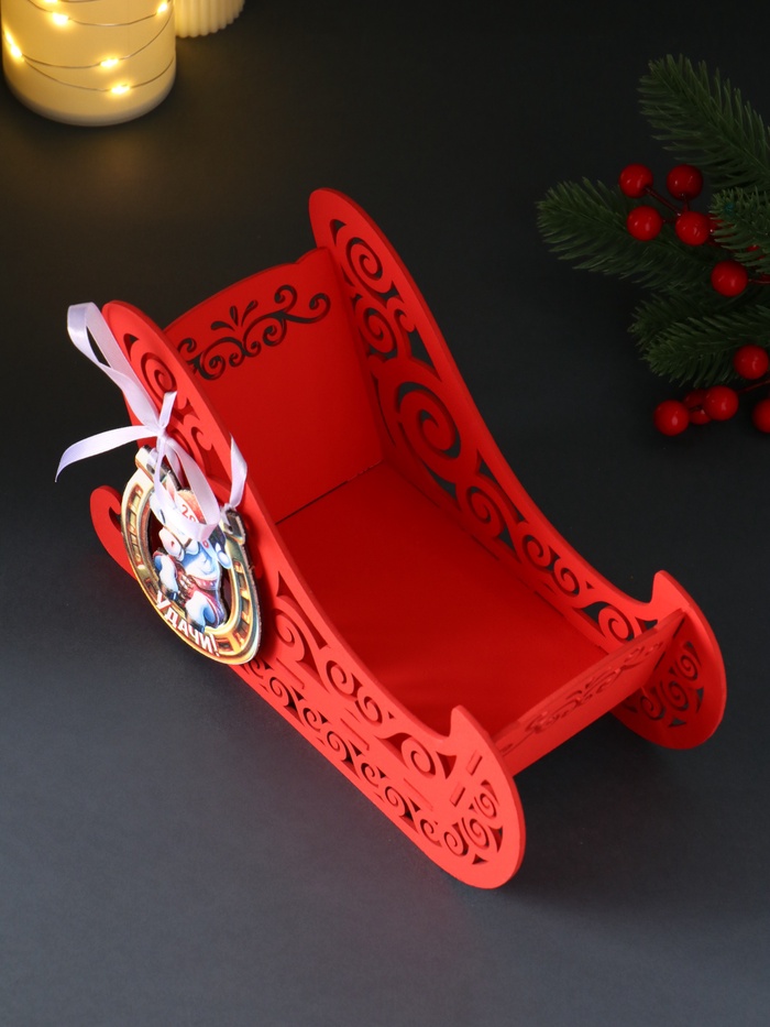 - Праздничная тематика: красный цвет и форма саней отлично впишутся в новогодний интерьер и станут прекрасным дополнением к презенту.