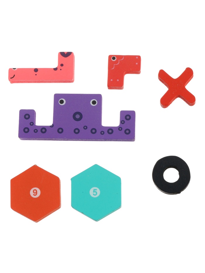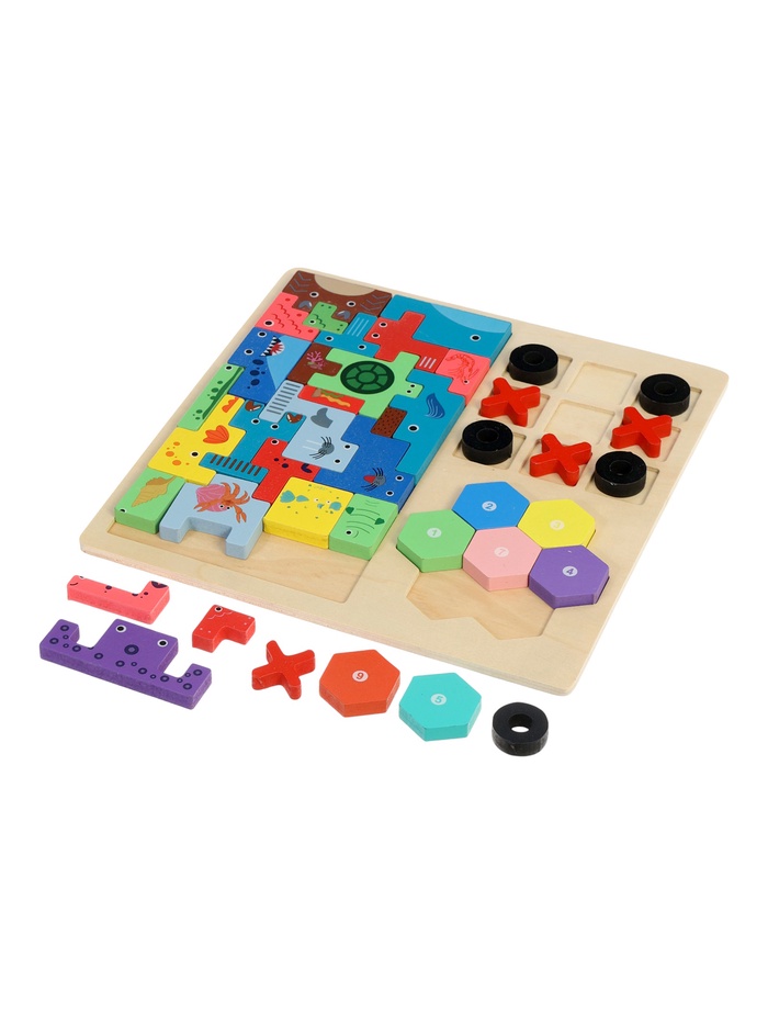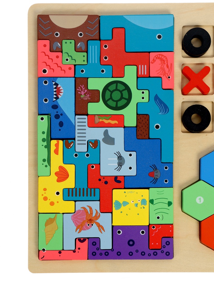 - Головоломка в стиле “Тетрис”: крупные деревянные элементы разной формы нужно разместить в рамке, подбирая комбинации. Детали украшены яркими рисунками животных и морских обитателей — это делает игру нагляднее и помогает ребёнку ориентироваться в поле.