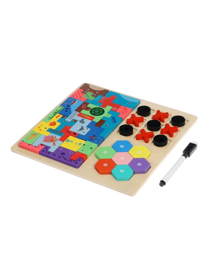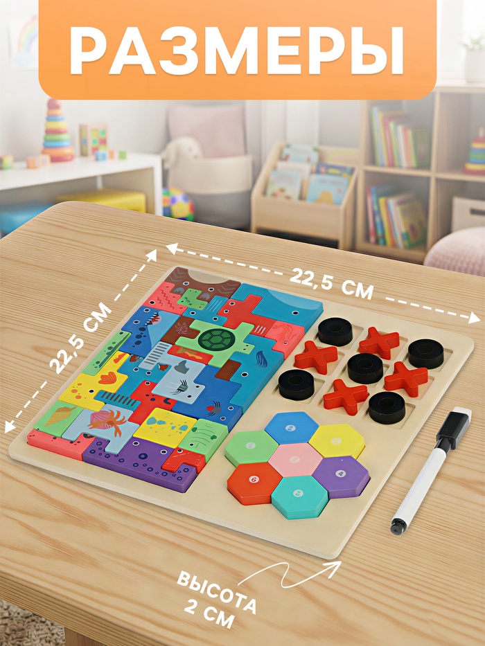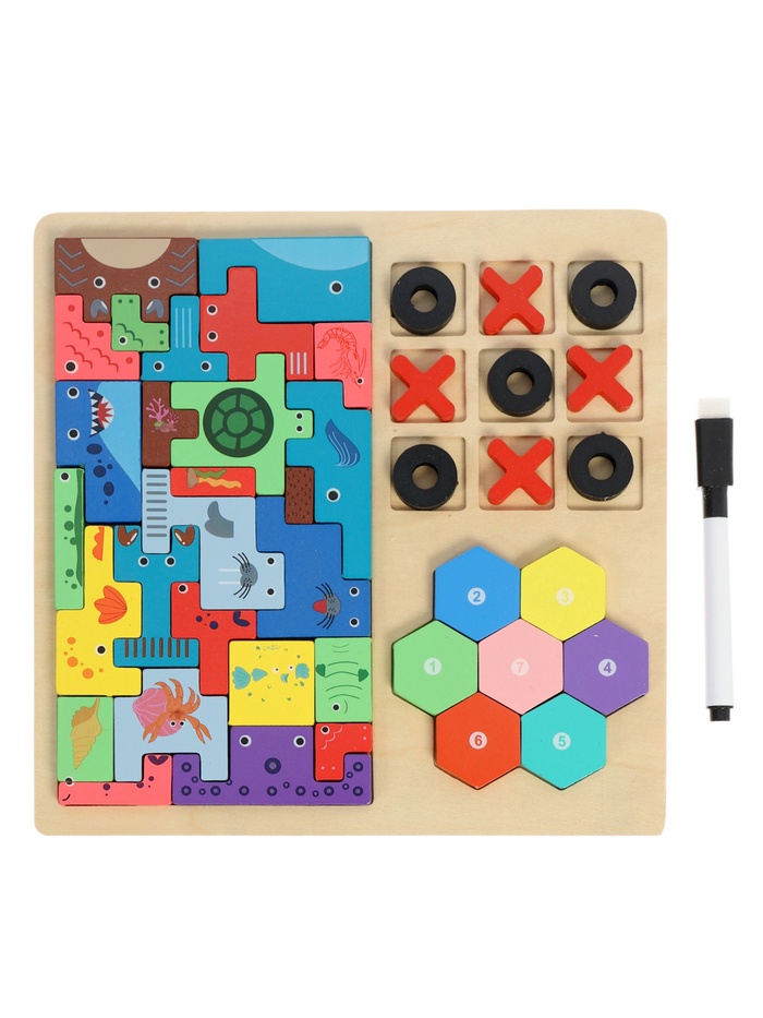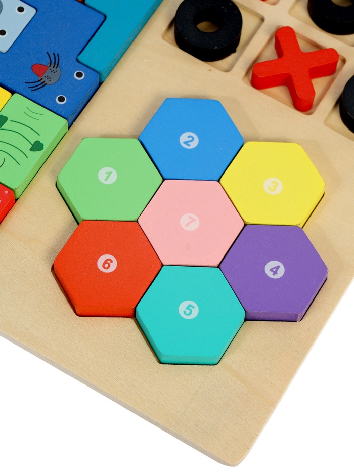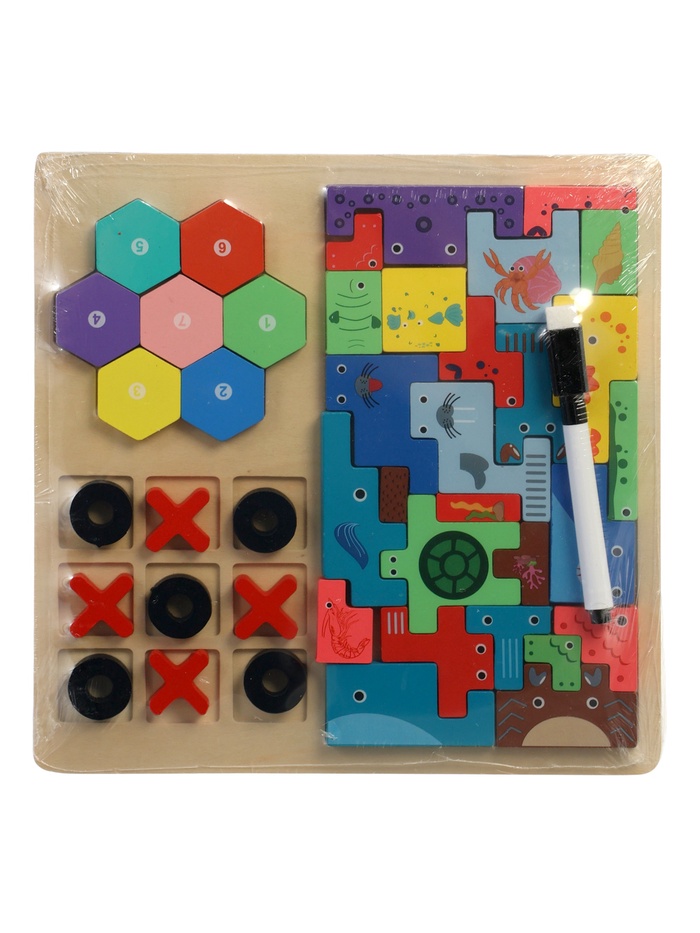 Одна доска — несколько увлекательных игр для развития логики, внимания и самостоятельного мышления. Многофункциональный деревянный набор с тетрис-элементами объединил сразу три популярные развивающие игры, которые подходят детям с раннего возраста и помогают мягко поддерживать интерес к умственной активности.