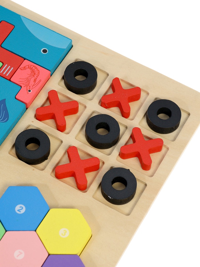 - Игра “Крестики-нолики”: отдельный сектор с ячейками и объёмными фишками формирует базовое понимание логики, последовательности ходов и игровых правил. Подходит для спокойных семейных партий и первых попыток ребёнка планировать свои действия.