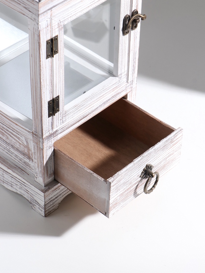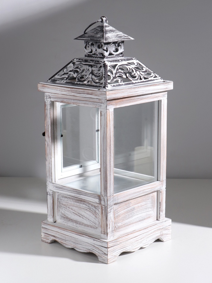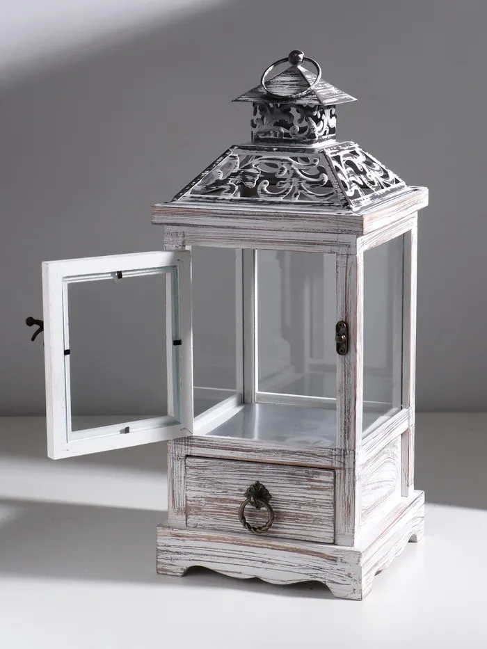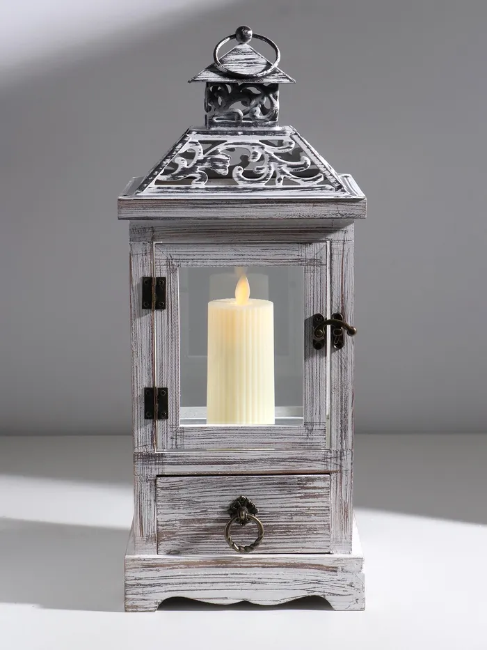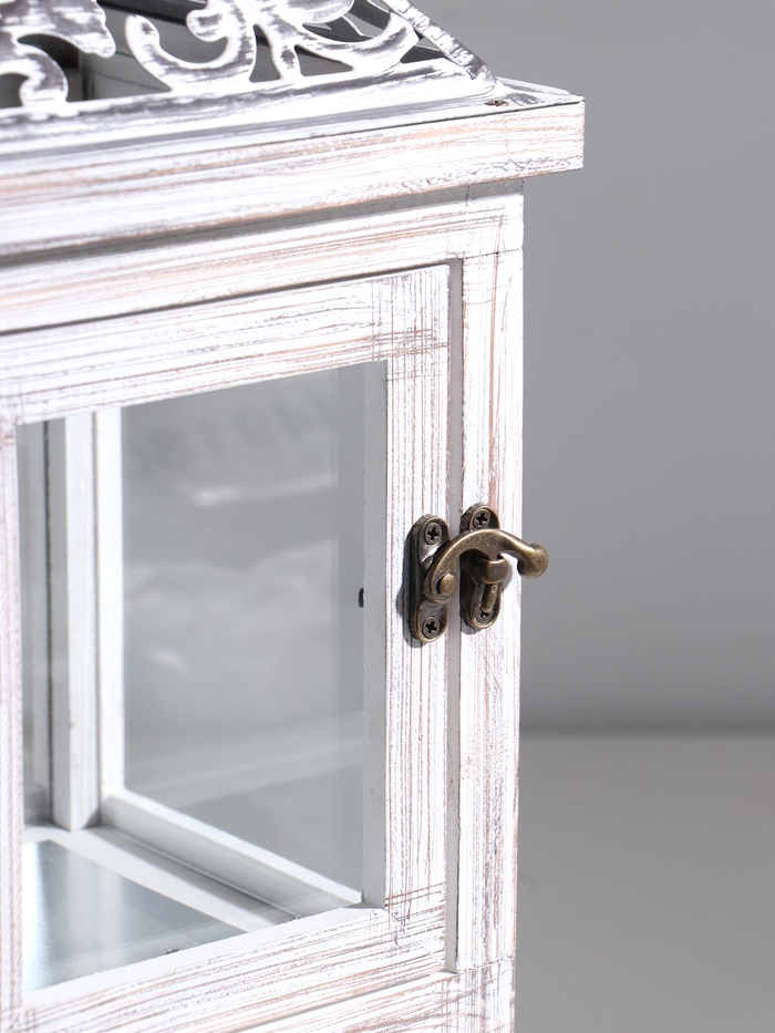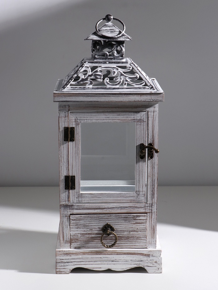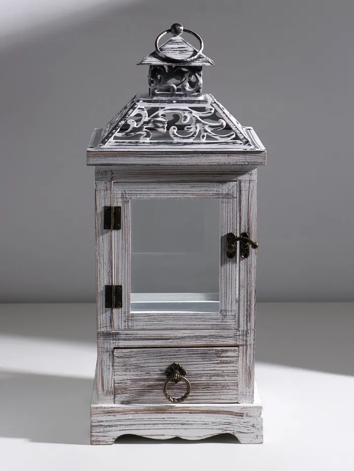 Деревянный подсвечник-фонарь на 1 свечу «С узорами на крыше», с ящиком, беж, 46×18×18 см — Характеристики