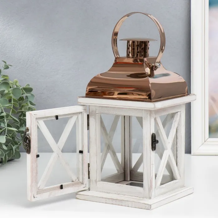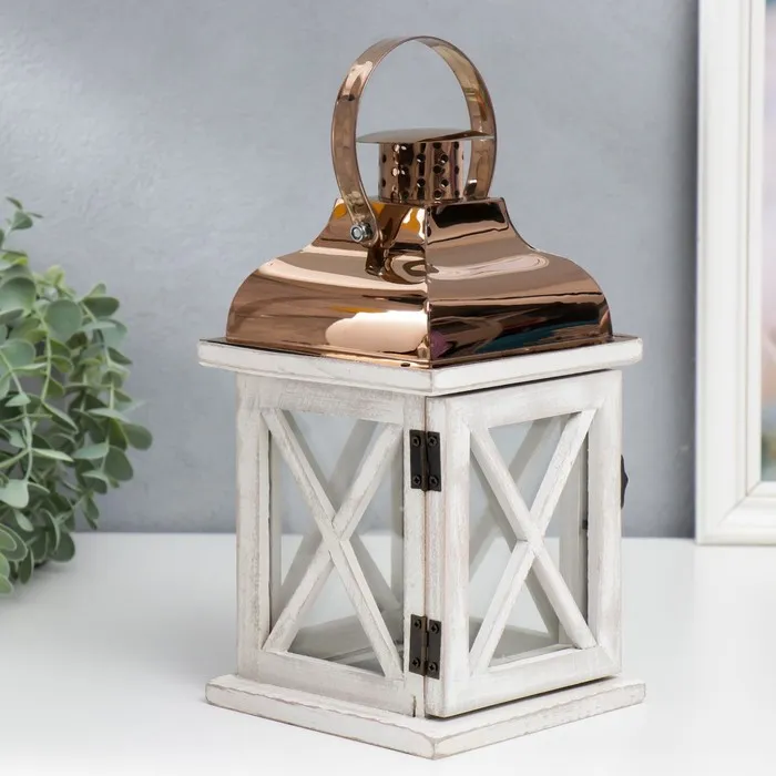 Деревянный подсвечник-фонарь на 1 свечу «Царь», серый и медь, 24.5×13.5×13.5 см — Характеристики