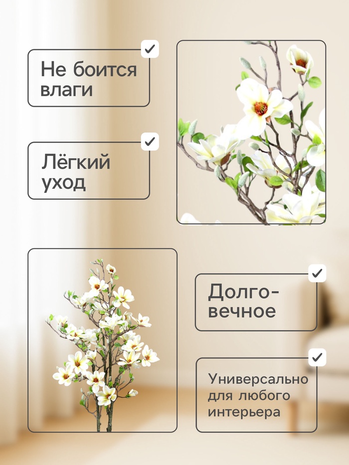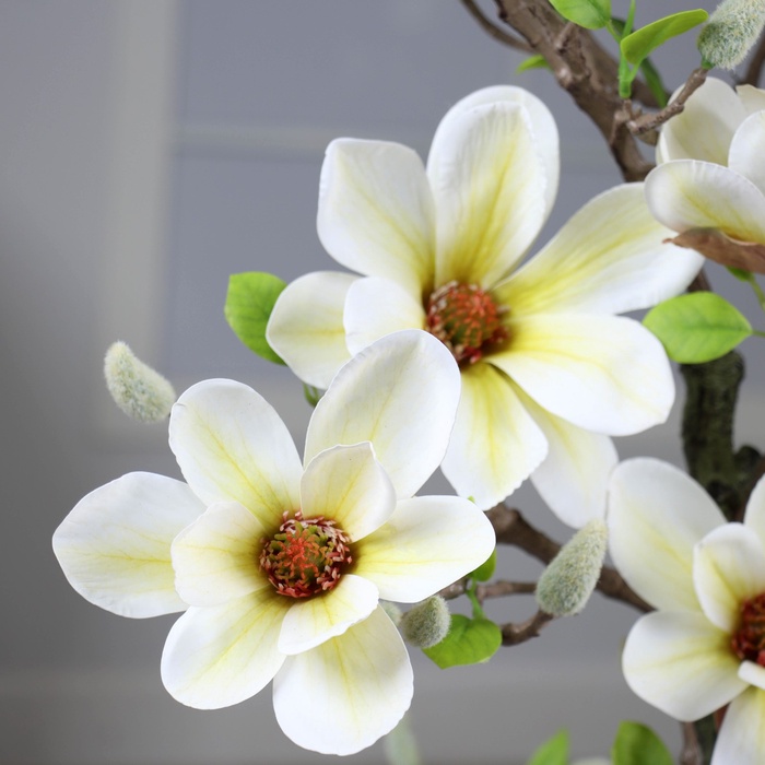- Минимальный уход: искусственная магнолия не требует полива или особого ухода, что позволяет наслаждаться её красотой без лишних хлопот.