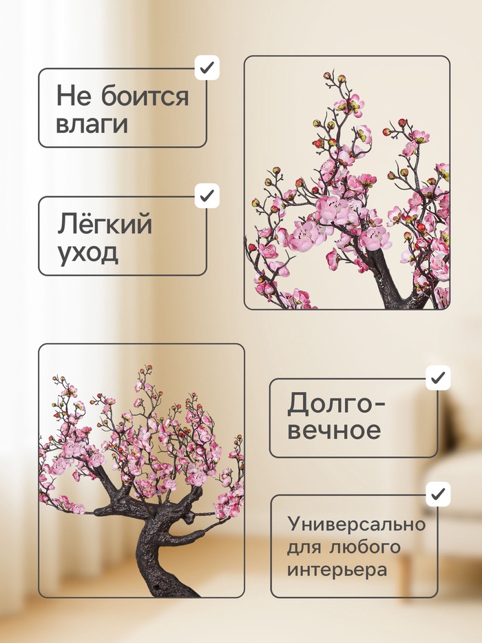 - Удобство ухода: искусственная сакура не требует полива или обрезки, что позволяет вам наслаждаться её красотой без лишних хлопот.