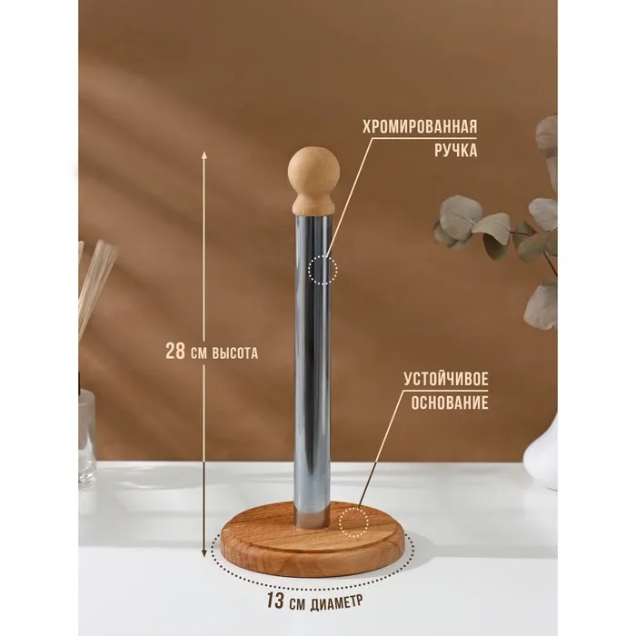 Держатель для бумажных полотенец – необходимый кухонный аксессуар! С ним полотенца всегда находятся в одном месте, а при отрывании нужного количества, рулон не падает со стола. Обратите внимание держатель изготовлен из натурального дерева. Природному материалу свойственна рельефная неоднородная поверхность, а также оттенок изделия может немного отличаться. Это особенность не является браком! Для дополнительной обработки поверхности и защиты от влаги рекомендуем использовать масло для деревянной посуды арт. 5599486.