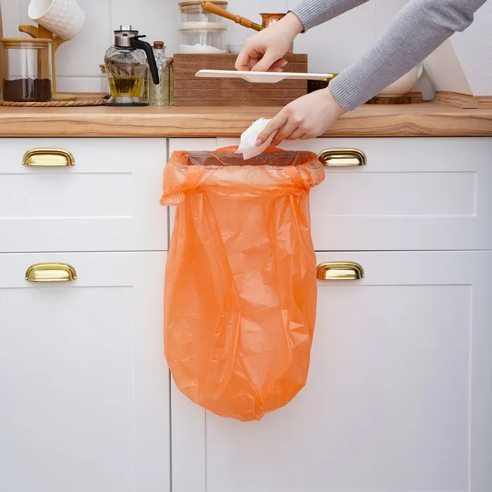 Легко использовать с мусорными мешками любых размеров и видов. Удобно использовать во время приготовления пищи: закрепите изделие на дверце и сметайте мусор прямо в мешок. Крышка предотвращает распространение неприятных запахов.