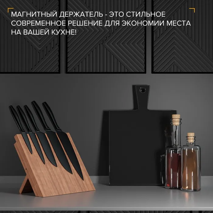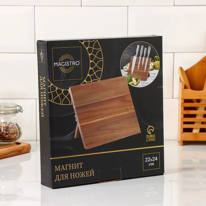 Магнитный держатель - это стильное современное решение для экономии места на вашей кухне! Основание держателя сделано из акации. Изделие имеет силиконовые опоры, которые предотвращают скольжение и защищают поверхность от возможных повреждений. Рекомендуем протирать ножи после мытья, затем крепить их на магнитную ленту. Держатель для ножей сохранит остроту лезвия и добавит уюта на вашу кухню.