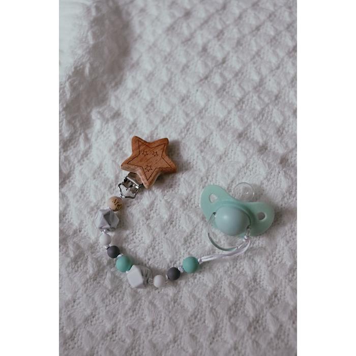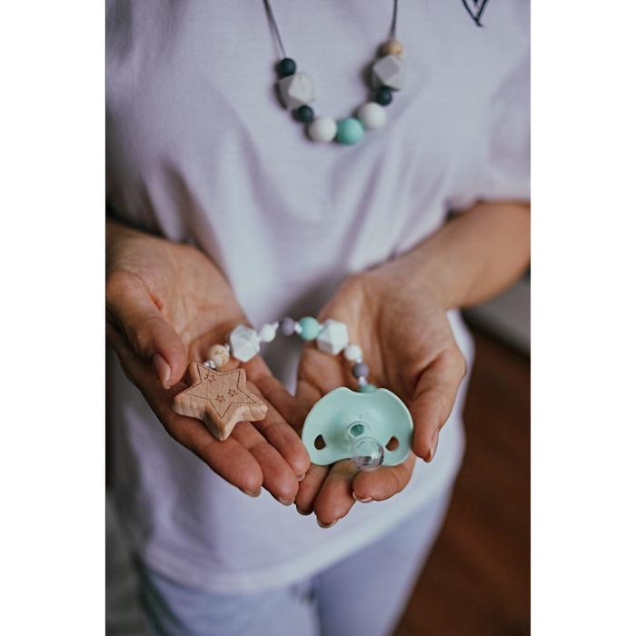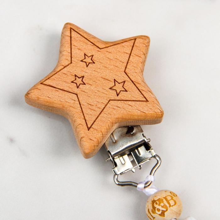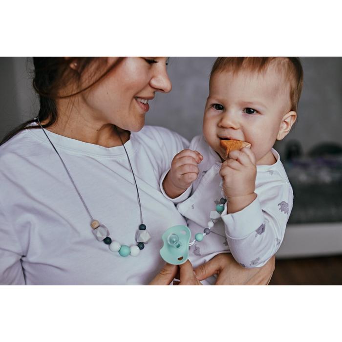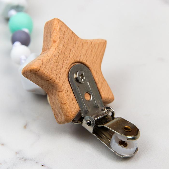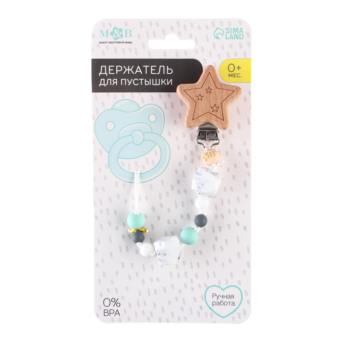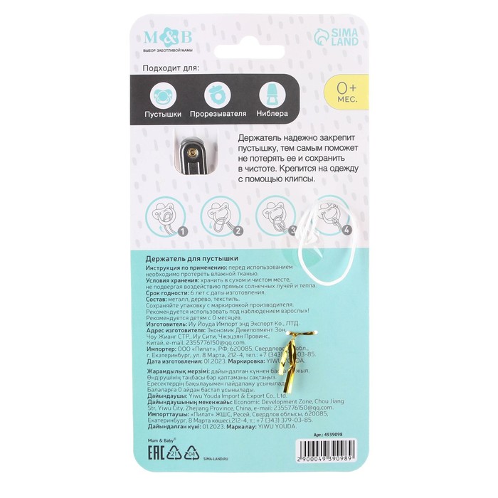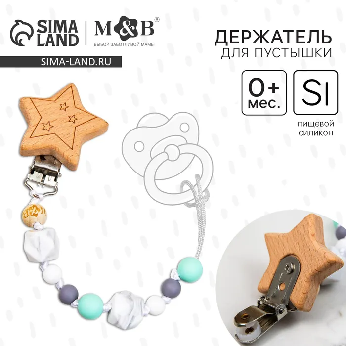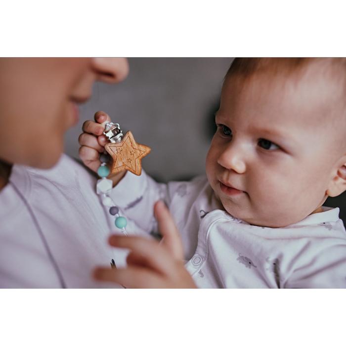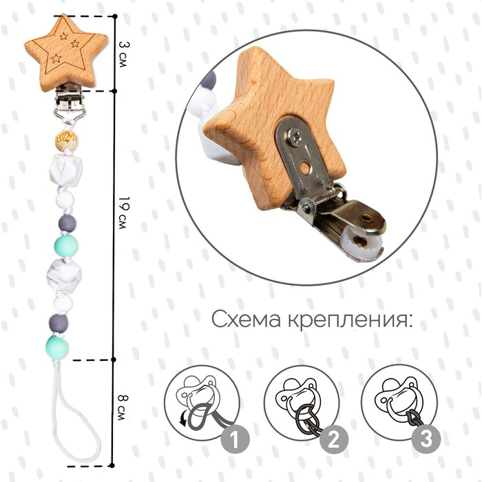Изделие фиксируется на одежде ребёнка. На конце цепочки есть карабин, который зацепляется за кольцо пустышки. Надёжное крепление убережёт вещь от падения на пол, если малютка случайно выронит её изо рта.