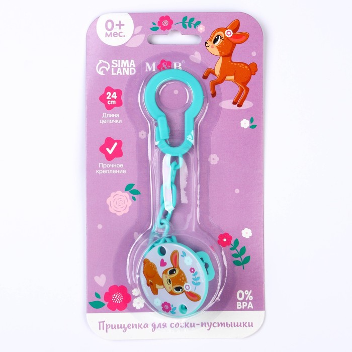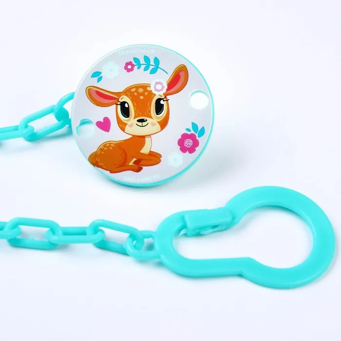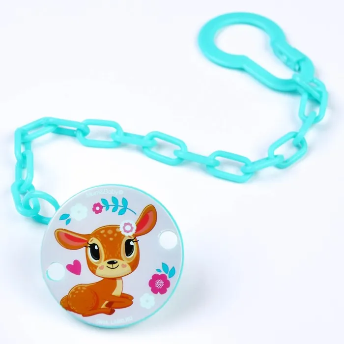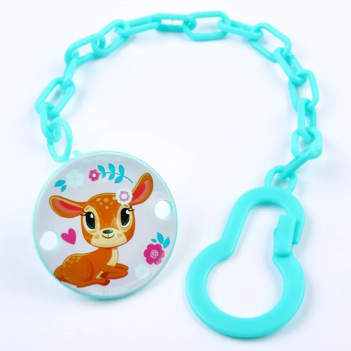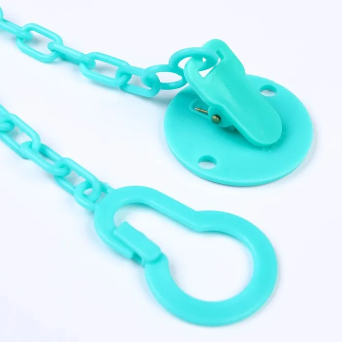 Изделие фиксируется на одежде ребёнка. На конце цепочки есть карабин, который зацепляется за кольцо пустышки. Надёжное крепление убережёт вещь от падения на пол, если малютка случайно выронит её изо рта.