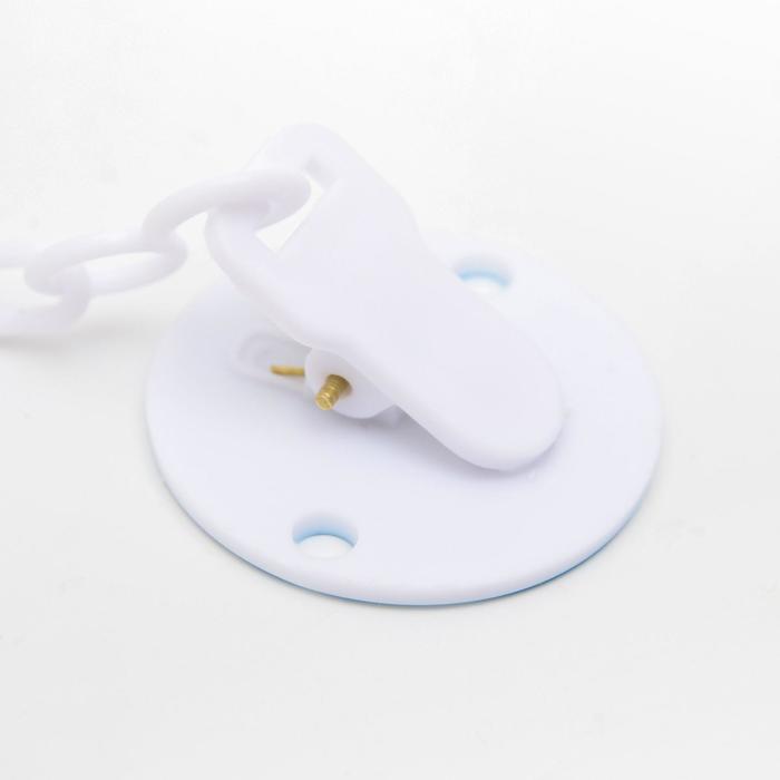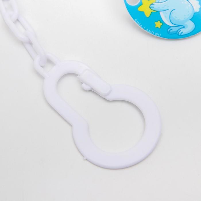 Изделие фиксируется на одежде ребёнка. На конце цепочки есть карабин, который зацепляется за кольцо пустышки. Надёжное крепление убережёт вещь от падения на пол, если малютка случайно выронит её изо рта.