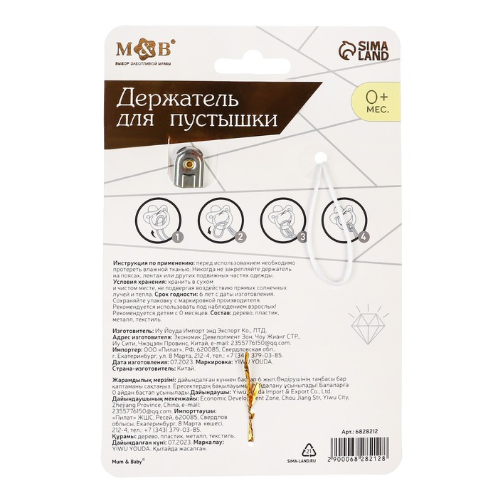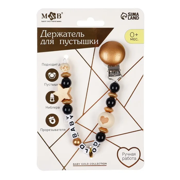 Изделие фиксируется на одежде ребёнка. На конце цепочки есть карабин, который зацепляется за кольцо пустышки. Надёжное крепление убережёт вещь от падения на пол, если малютка случайно выронит её изо рта.
