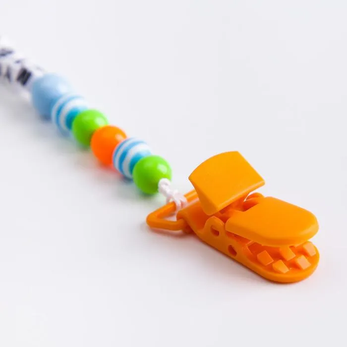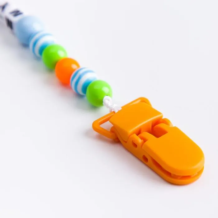 Изделие фиксируется на одежде ребёнка. На конце цепочки есть карабин, который зацепляется за кольцо пустышки. Надёжное крепление убережёт вещь от падения на пол, если малютка случайно выронит её изо рта.