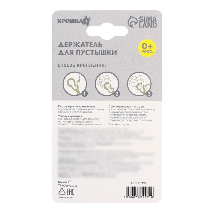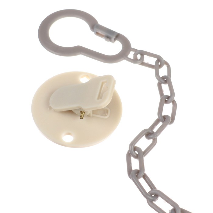Прищепка для пустышки предотвратит потерю маленького предмета. Используйте специальный держатель, и соска всегда будет под рукой!Изделие фиксируется на одежде ребёнка. На конце цепочки есть карабин, который зацепляется за кольцо пустышки. Надёжное крепление убережёт вещь от падения на пол, если малютка случайно выронит её изо рта.С держателем можно играть, притягательный дизайн точно понравится малышу.Товар изготовлен из качественного нетоксичного материала. Подходит для деток с рождения.