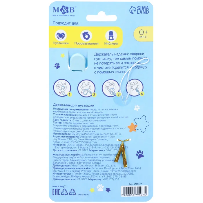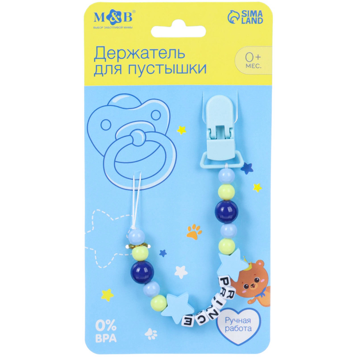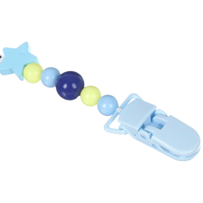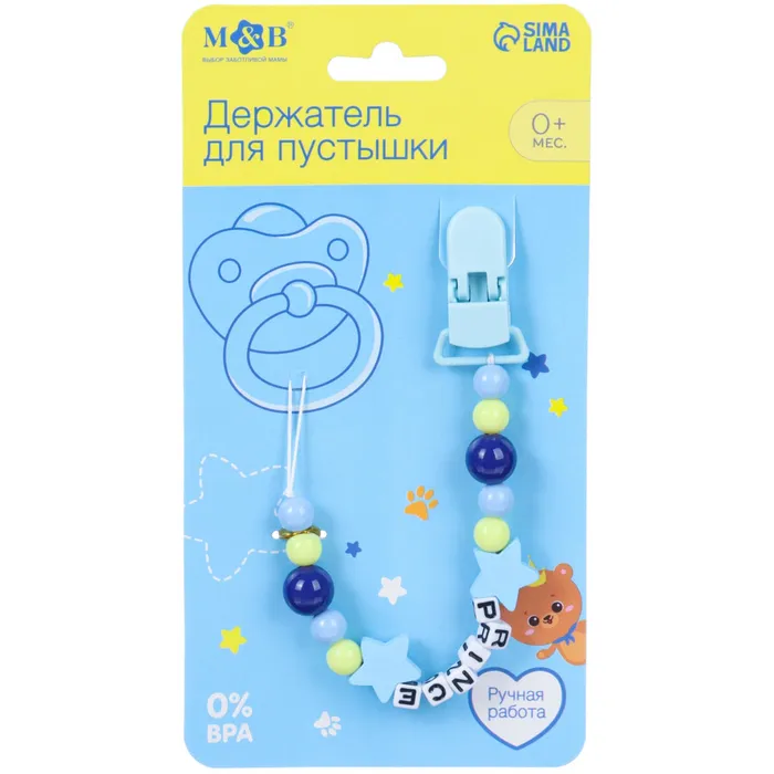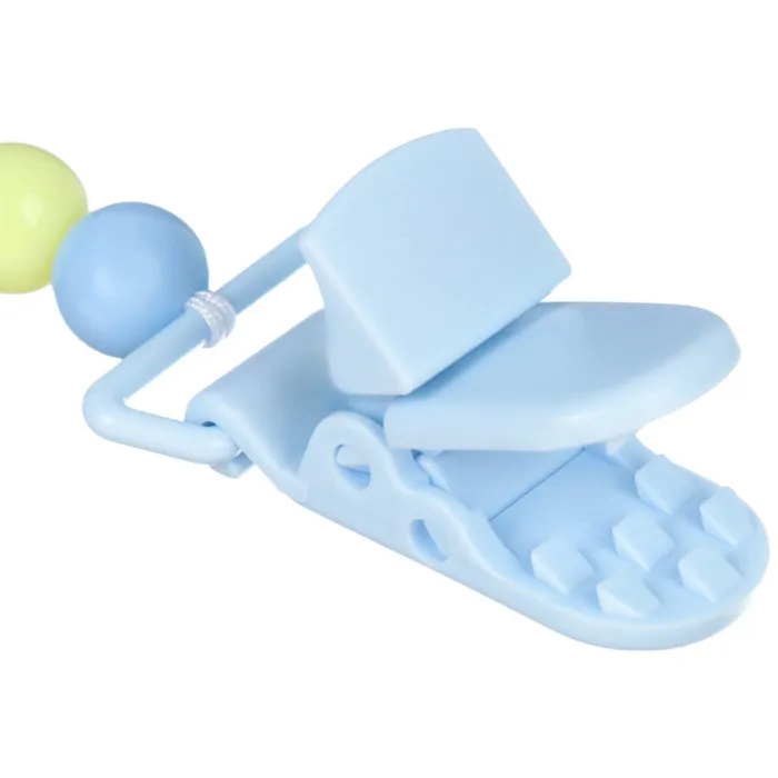 Изделие фиксируется на одежде ребёнка. На конце цепочки есть карабин, который зацепляется за кольцо пустышки. Надёжное крепление убережёт вещь от падения на пол, если малютка случайно выронит её изо рта.