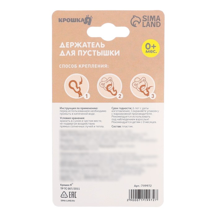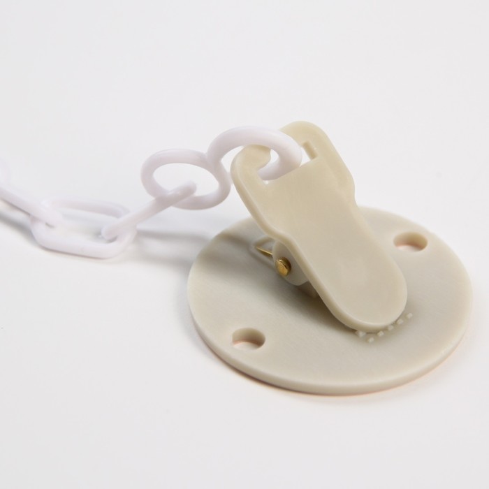 Прищепка для пустышки предотвратит потерю маленького предмета. Используйте специальный держатель, и соска всегда будет под рукой!Изделие фиксируется на одежде ребёнка. На конце цепочки есть карабин, который зацепляется за кольцо пустышки. Надёжное крепление убережёт вещь от падения на пол, если малютка случайно выронит её изо рта.С держателем можно играть, притягательный дизайн точно понравится малышу.Товар изготовлен из качественного нетоксичного материала. Подходит для деток с рождения.
