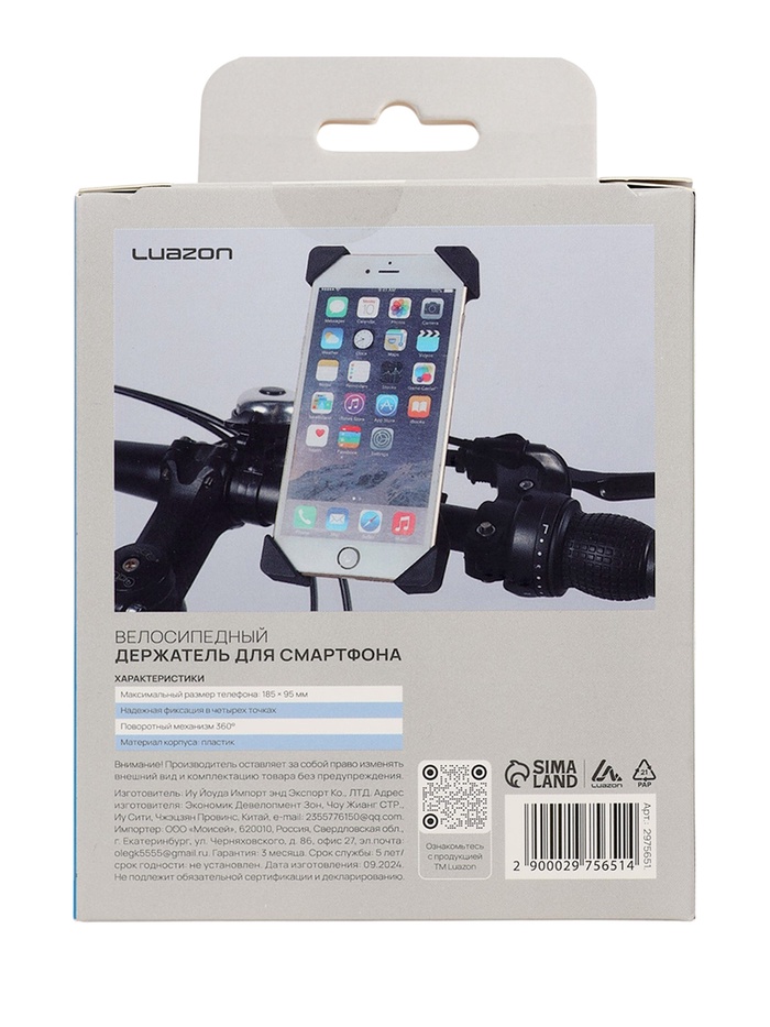Держатель для телефона на велосипед Luazon, до 185×95 мм, чёрный — Характеристики