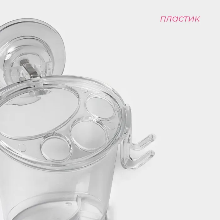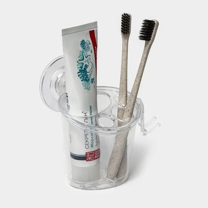 Состоит из крючка для бритвы и четырёх секций, что позволяет удобно разместить не только зубные щетки, но и зубную пасту, обеспечивая порядок. Уникальная фигурная форма добавляет оригинальности, а прозрачный материал делает его практически невидимым, что помогает сохранить аккуратный вид вашего пространства.