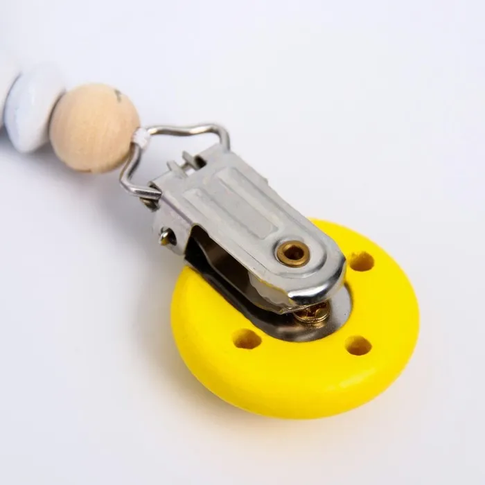Изделие фиксируется на одежде ребёнка. На конце цепочки есть карабин, который зацепляется за кольцо пустышки. Надёжное крепление убережёт вещь от падения на пол, если малютка случайно выронит её изо рта.